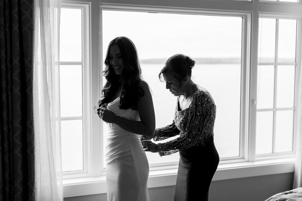 Angela and Charlie’s Bay Harbor Yacht Club wedding morning began with a view that took everyone’s breath away. Sunlight glowed over Little Traverse Bay and into their suites as the day began. With both rooms overlooking the water, it was the perfect calm start to their Northern Michigan wedding day.